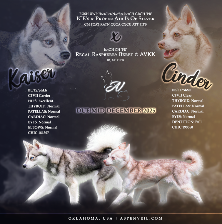 Our pairings are carefully considered months, if not years, before even designating the time of the breeding. All Aspen Veil dogs are fully health-tested and championed with at least one performance title before fully eligible for the breeding. Due to the program's preference to test the dogs' hips and elbows, they are also not bred before the age of two. This also allows them more time to mature physically and mentally, which will benefit the overall health for the puppies and the adults they'll grow up to be.
